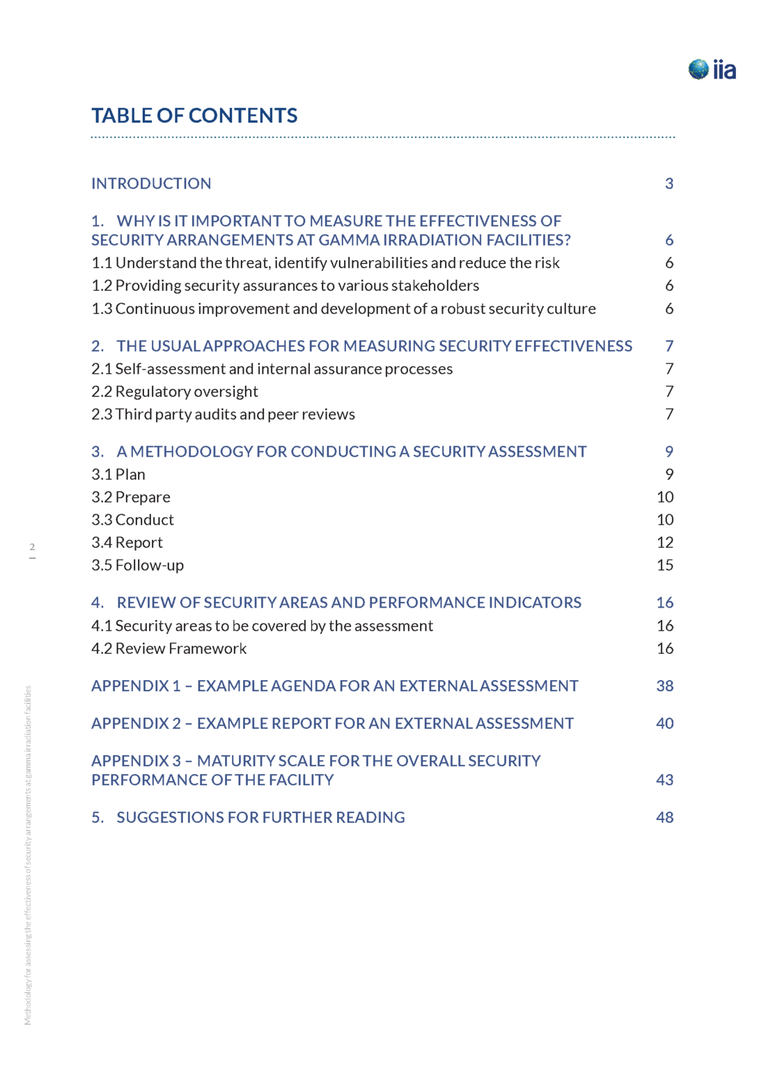 This document outlines a methodology for assessing the security of gamma irradiation facilities, which use cobalt-60 sources to process materials for applications like sterilisation and material enhancement. Due to the presence of radioactive sources, these facilities must implement robust security measures to prevent potential threats. It emphasises the importance of regularly reviewing and improving security protocols to address evolving risks and incorporate new technologies.